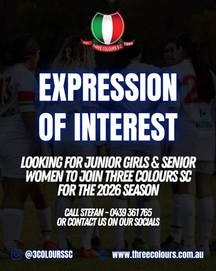 JUNIOR GIRLS & SENIOR WOMEN’S Three Colours SC are opening ‘Expression of Interest’ for any junior girls (aged 11 – 16), and senior women’s (aged 16+) to join for the 2026 season! Contact Stefan (President) on 0439 361 765, or DM us on our socials @3colourssc (Instagram) Three Colours Soccer Club #ThreeColoursSC #3CSC