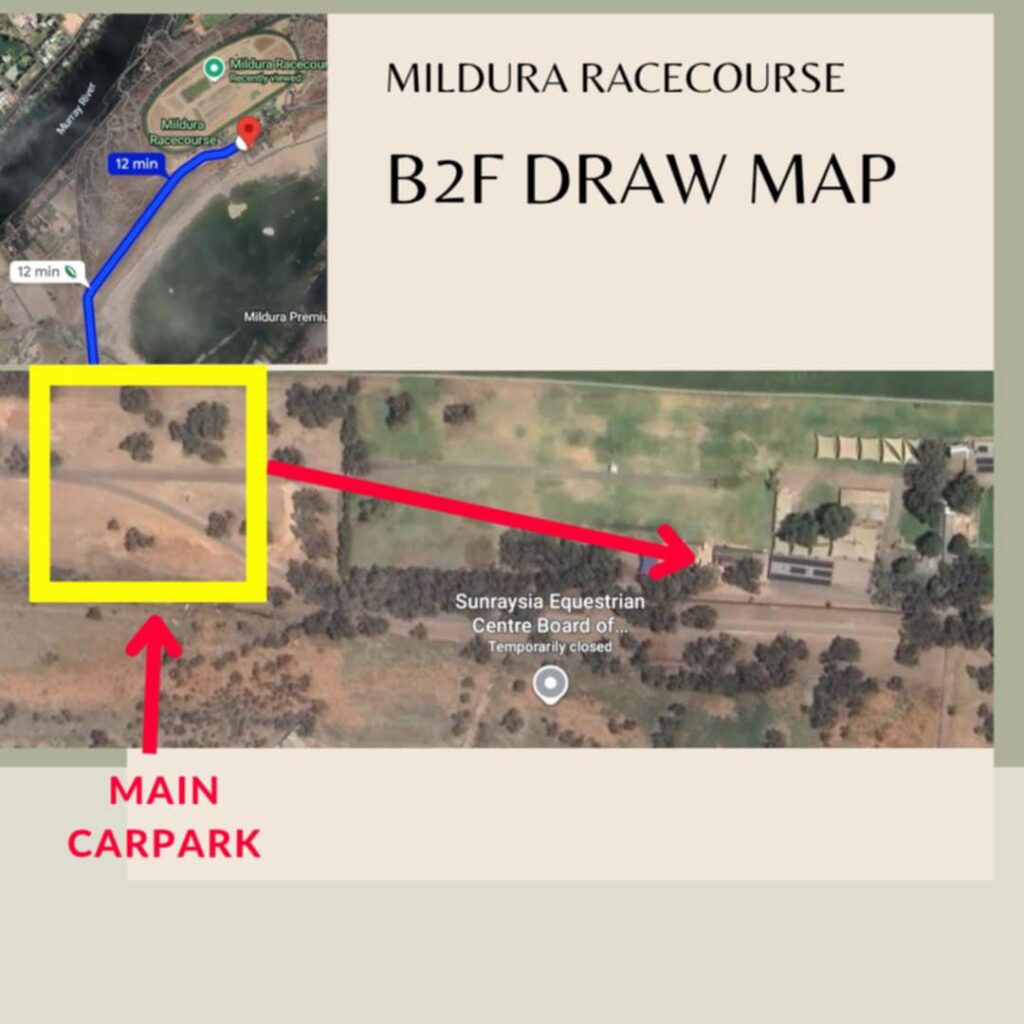 Back to Front Draw Night Saturday 9 August Mildura Racecourse Map & Car Park Area provided below for your convenience. Don’t forget to bring some coins for a few fun games on the night! See you there for a great night of food, fun & prizes