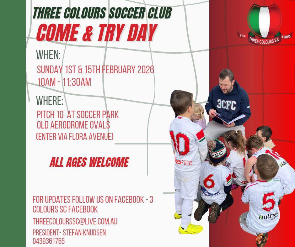 Our Come & Try Days are a fun, relaxed way for kids to try soccer for the first time, meet new friends, and see what our club is all about at Three Colours Soccer Club